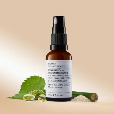 Next, apply a serum specifically formulated to treat hyperpigmentation. Evolve Resveratrol + Niacinamide Serum combines the brightening properties of Resveratrol and Niacinamide to inhibit melanin production, fade dark spots, and even out skin tone.